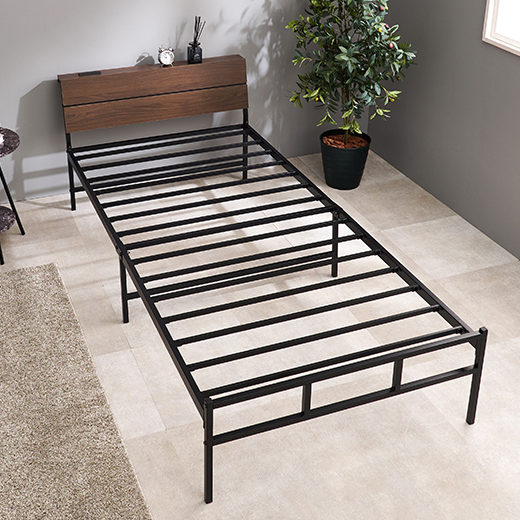 シングルベッド 木目調 頑丈 強化スチール素材 コンセント付き フレームのみ