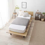 シンプルな木目のパネルに黒い脚が映える、スタイリッシュなデザイン性を持つシングルベッドです。お部屋をすっきりとした印象にすることができ、小さいマットレスと組み合わせることでステージベッドのような使い方も可能です。WOOD GRAIN x BLACK LEGの組み合わせがお部屋に洗練された雰囲気を演出します。