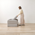肘掛けを倒すとカウチソファに早変わりし、読書やTV鑑賞など様々なシーンで活躍します。身長約150cmのモデルでも快適に使用できるサイズ感で、脚を伸ばしてリラックスしたり、両肘を倒して広々と寝転ぶことも可能です。また、足の疲れやむくみを解消するためにもおすすめのスタイルです。