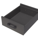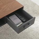 引き出しは両面から引き出せる設計で、テレビリモコンや雑誌だけでなく、さまざまな小物を収納できます。また、引き出し内部にはダークトーンの塗装が施され、床への傷防止用のフェルト付き脚も備えています。